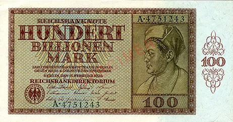 تورم آلمان در سال ۱۹۲۳ به اوج خود رسید: ۲۹٬۵۰۰ درصد. در آن زمان، بزرگ‌ترین اسکناس چاپ‌شده ۱۰۰ تریلیون مارک بود که تنها ۲۴ دلار ارزش داشت.