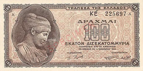 با افزایش قیمت‌ها، نیروهای اشغالگر به مقدار بیشتری دراخما نیاز داشتند. در سال ۱۹۴۴، یونان با بالاترین نرخ تورم یعنی ۳×۱۰¹⁰ درصد روبه‌رو گردید و اسکناس‌های ۱۰۰٬۰۰۰٬۰۰۰٬۰۰۰ دراخمایی منتشر شدند.